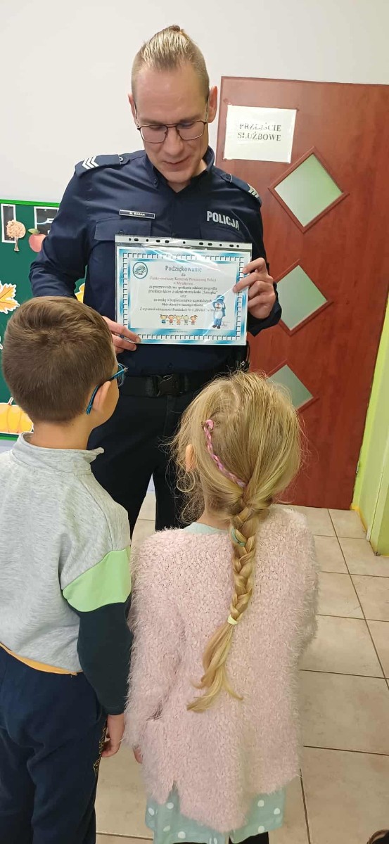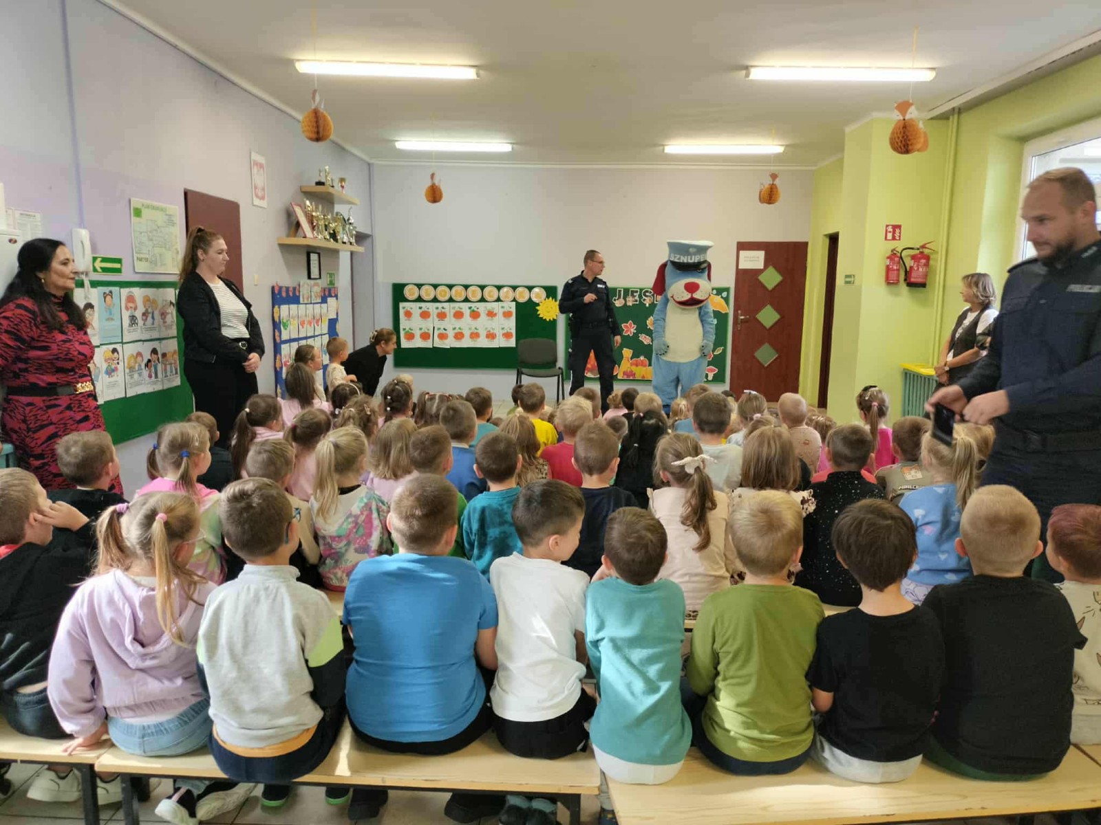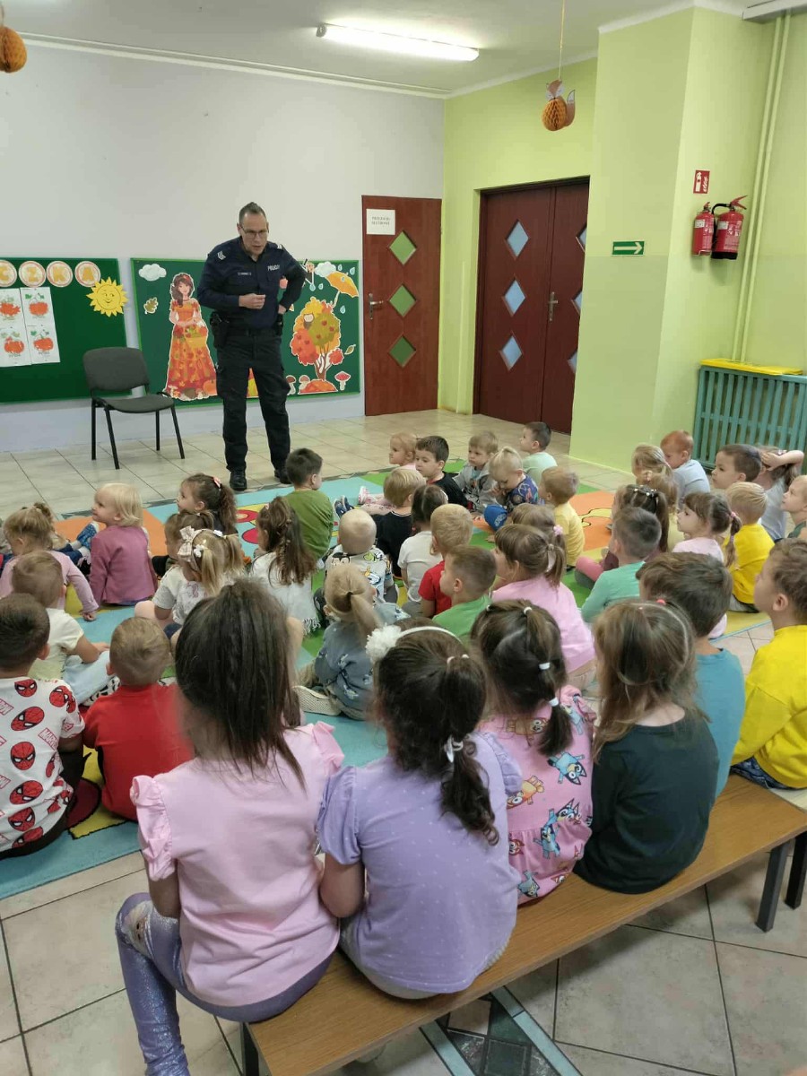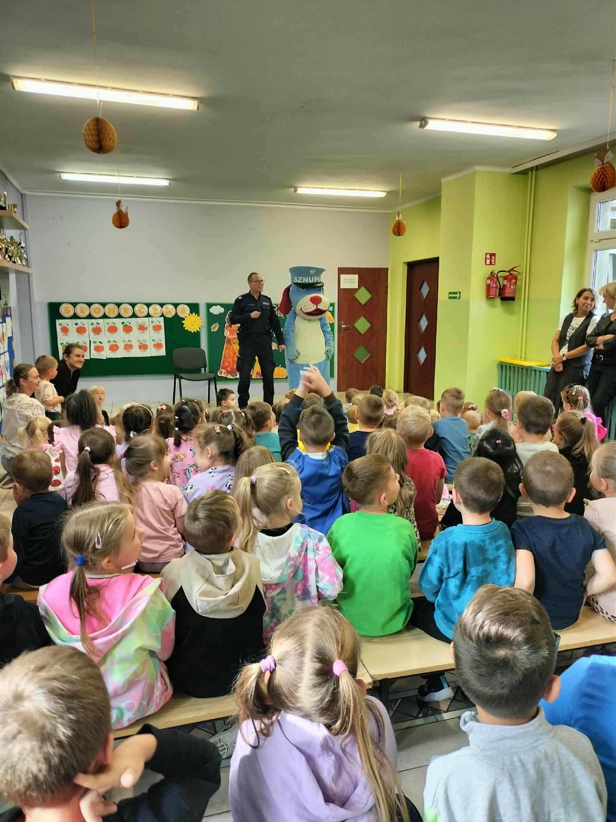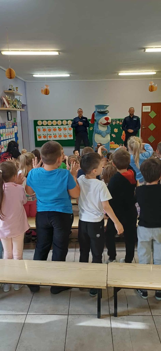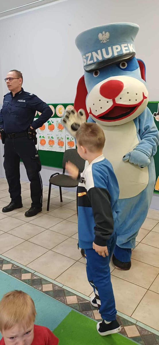 Dzieci miały okazję przypomnieć sobie m.in: czym zajmuje się policjant, jaki jest numer alarmowy, jakie są podstawowe zasady zachowania bezpieczeństwa na drodze oraz dlaczego nie można rozmawiać z nieznajomymi. Dzieci chętnie uczestniczyły w spotkaniu, odpowiadając na pytania zadawane przez Pana Policjanta. Na koniec uczestnicy spotkania mogli przybić „5” Sznupkowi. Spotkanie z Panem policjantem na długo zostanie w pamięci dzieci.