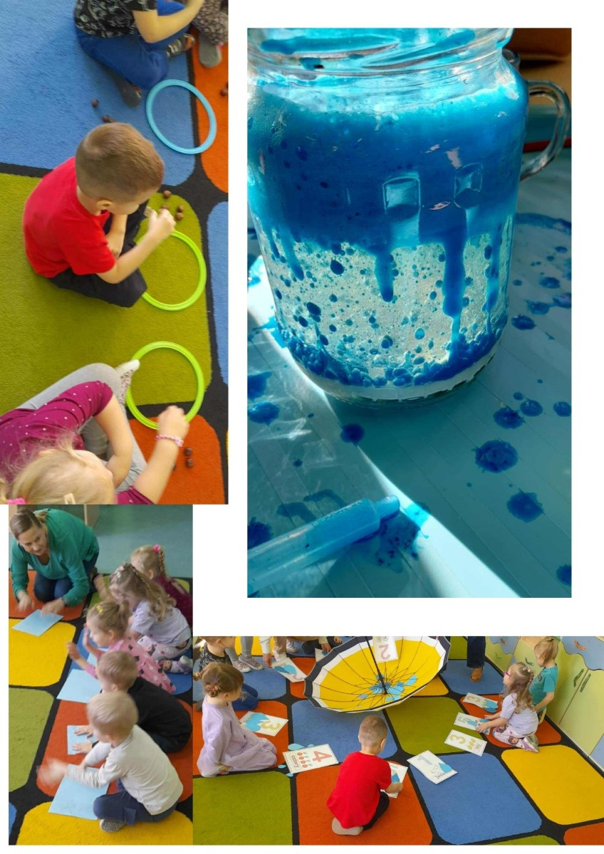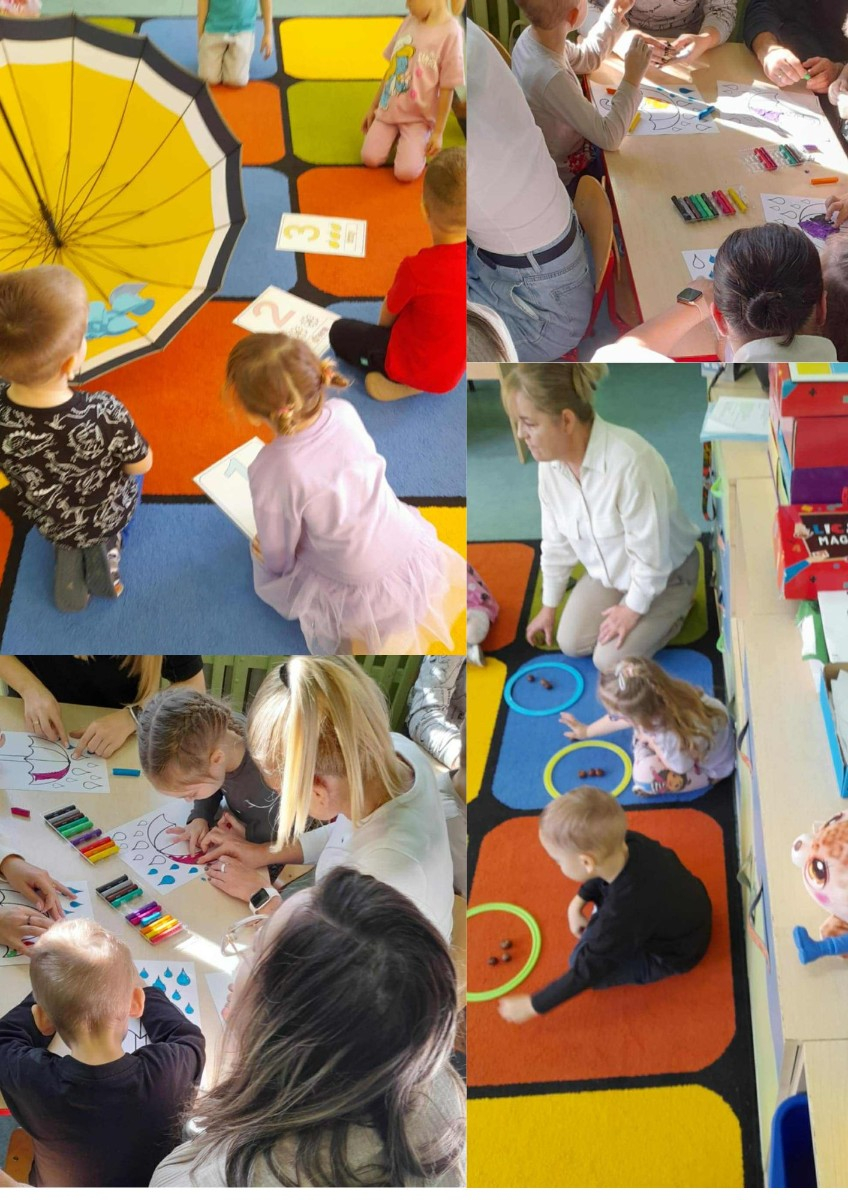 Celem spotkania było wspólne odkrywanie uroków jesiennej pogody, rozwijanie wyobraźni oraz kształtowanie pozytywnego nastawienia do zjawisk przyrodniczych. Podczas zajęć dzieci z radością uczestniczyły w różnorodnych zabawach ruchowych, muzycznych i plastycznych inspirowanych jesiennym deszczem. W rytm pogodnych piosenek dzieci naśladowały dźwięki kropel deszczu, tańczyły, a także wykonywały własnoręcznie prace plastyczne przedstawiające jesienne parasole i krople deszczu. Na koniec wykonały niezwykły eksperyment-deszcz w słoiku, podczas którego było moc radości zarówno ze strony dzieci, jak też i rodziców. Rodzice mieli okazję obserwować, jak ich pociechy uczą się poprzez zabawę, rozwijają zdolności motoryczne, muzyczne i społeczne, a przede wszystkim – jak świetnie się bawią. Na zakończenie zajęć wszyscy wspólnie zaśpiewali piosenkę o jesieni i stworzyli barwną „deszczową galerię” z kolorowych parasolek. Zajęcia wprowadziły dzieci w radosny, jesienny nastrój i przypomniały, że nawet deszczowa pogoda może być inspirująca i pełna zabawy! Serdecznie dziękujemy wszystkim rodzicom za udział we wspólnej zabawie