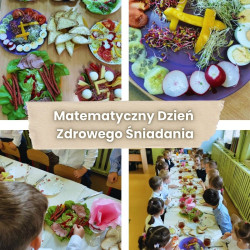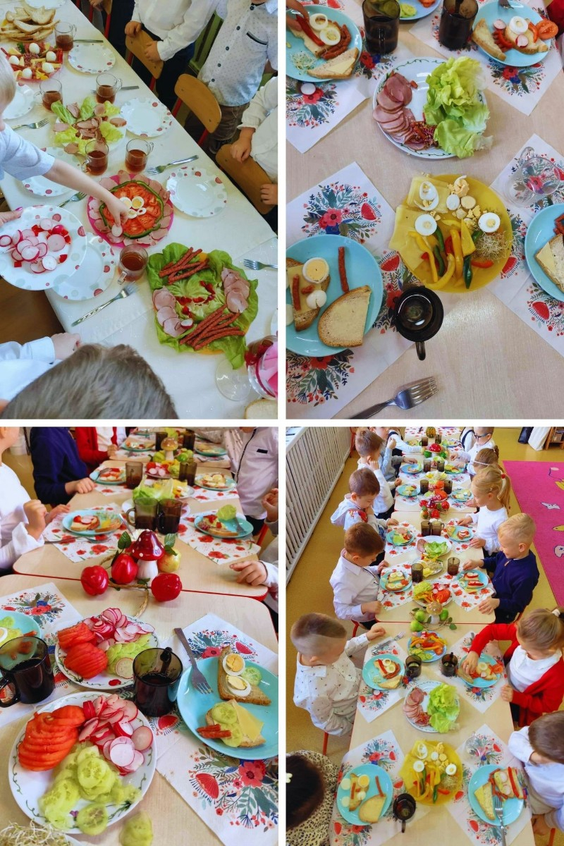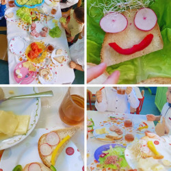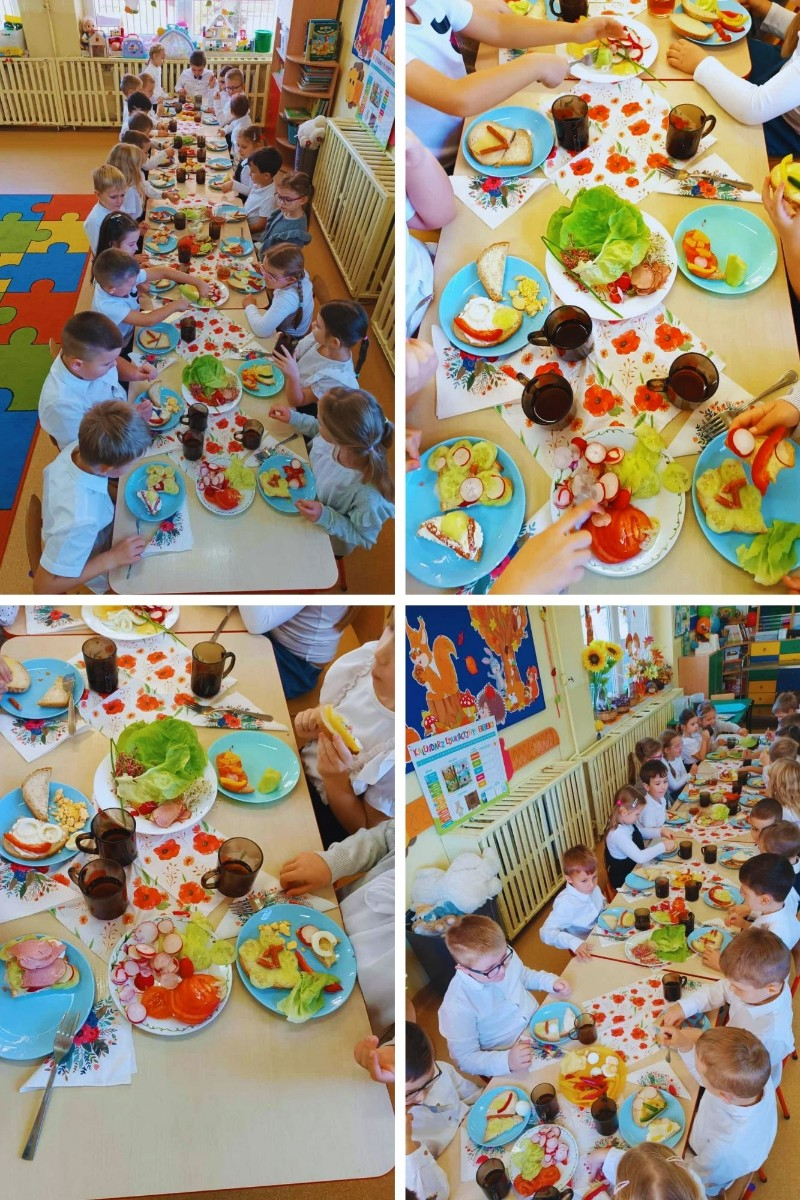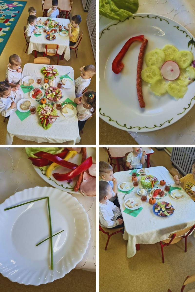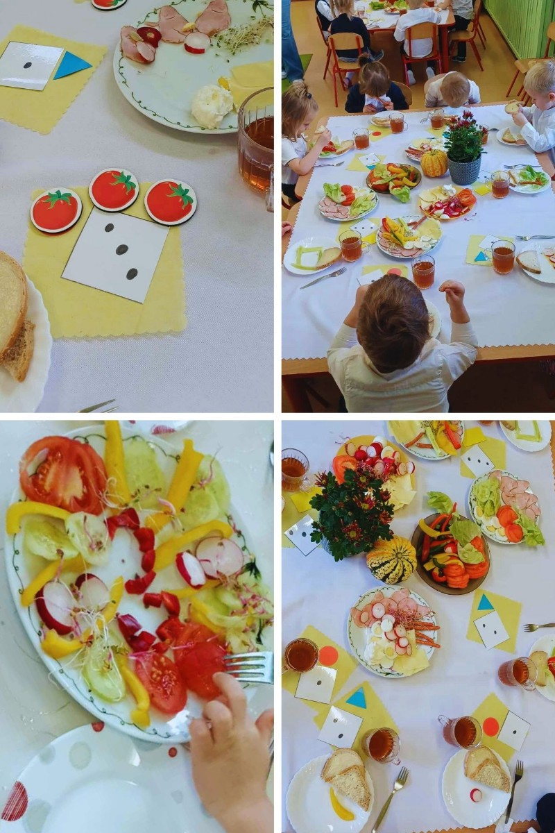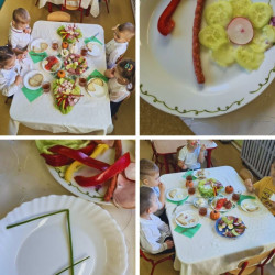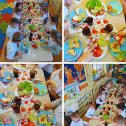 Przedszkolaki wykazały się wielkim zaangażowaniem i pomysłowością. Podczas tworzenia własnych przysmaków śniadaniowych z bardzo bogatej gamy produktów liczyły plasterki pomidorów, ogórków, jajek, rzodkiewki itd. Z kabanosów układały znane im cyferki i figury geometryczne. Segregowały również produkty według koloru, wielkości - tworząc w ten sposób kolorowe zbiory na talerzach.