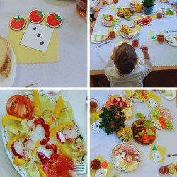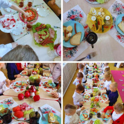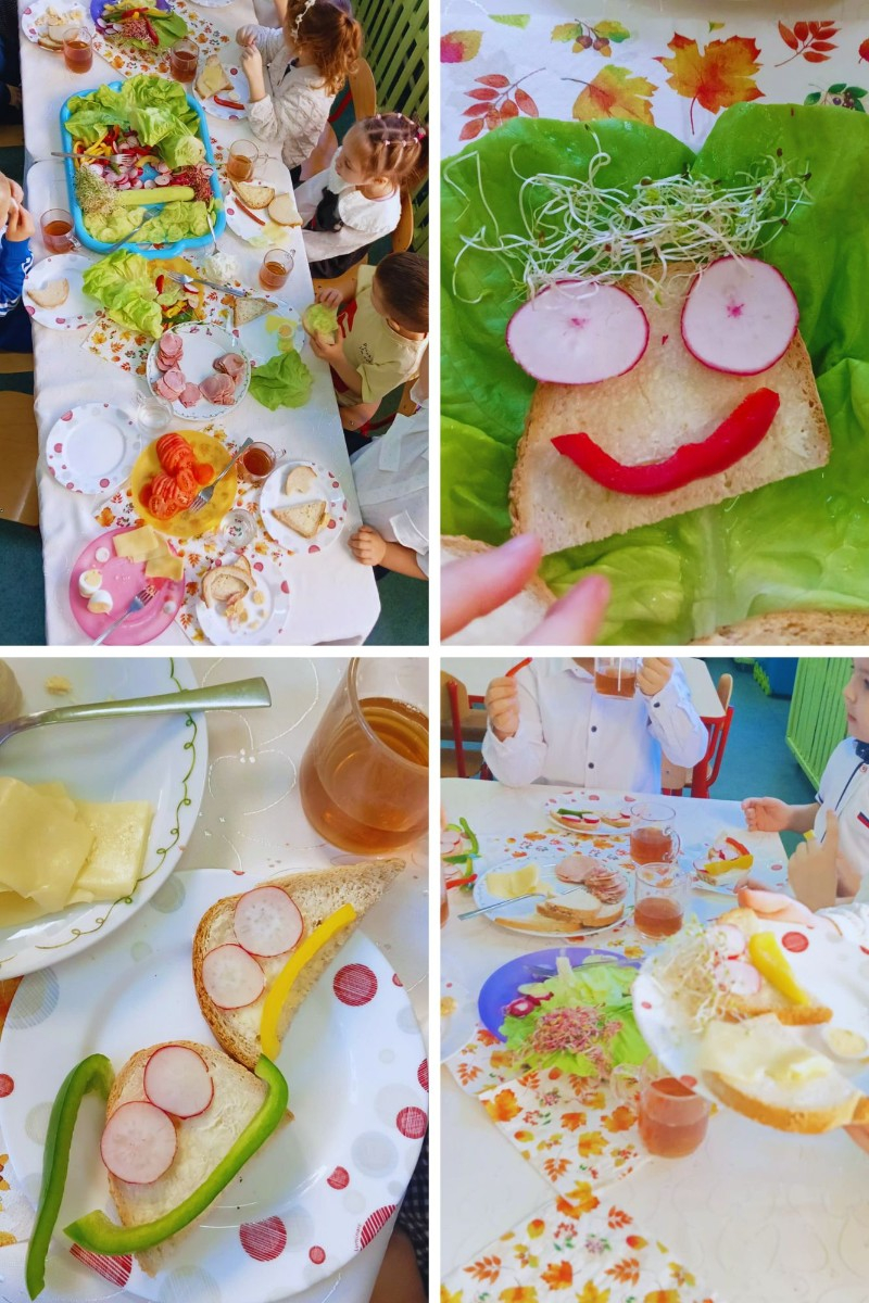 Tym razem naukę zdrowego odżywiania połączyliśmy z matematycznymi zabawami. Było to niezwykle doświadczenie dla dzieci, któremu towarzyszyły uśmiech i radość. Nasze przedszkolaki miały możliwość samodzielnego komponowania śniadania z warzyw, nabiału, pieczywa i wędlin.