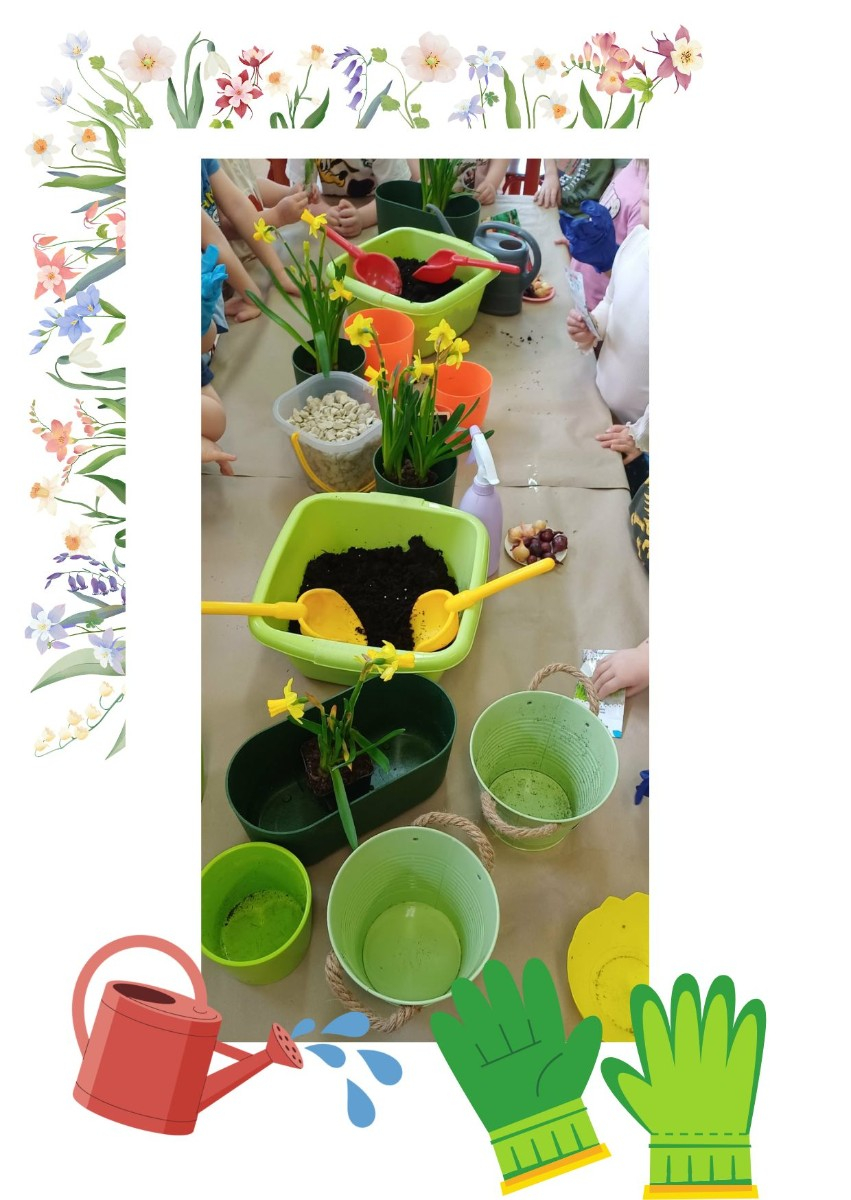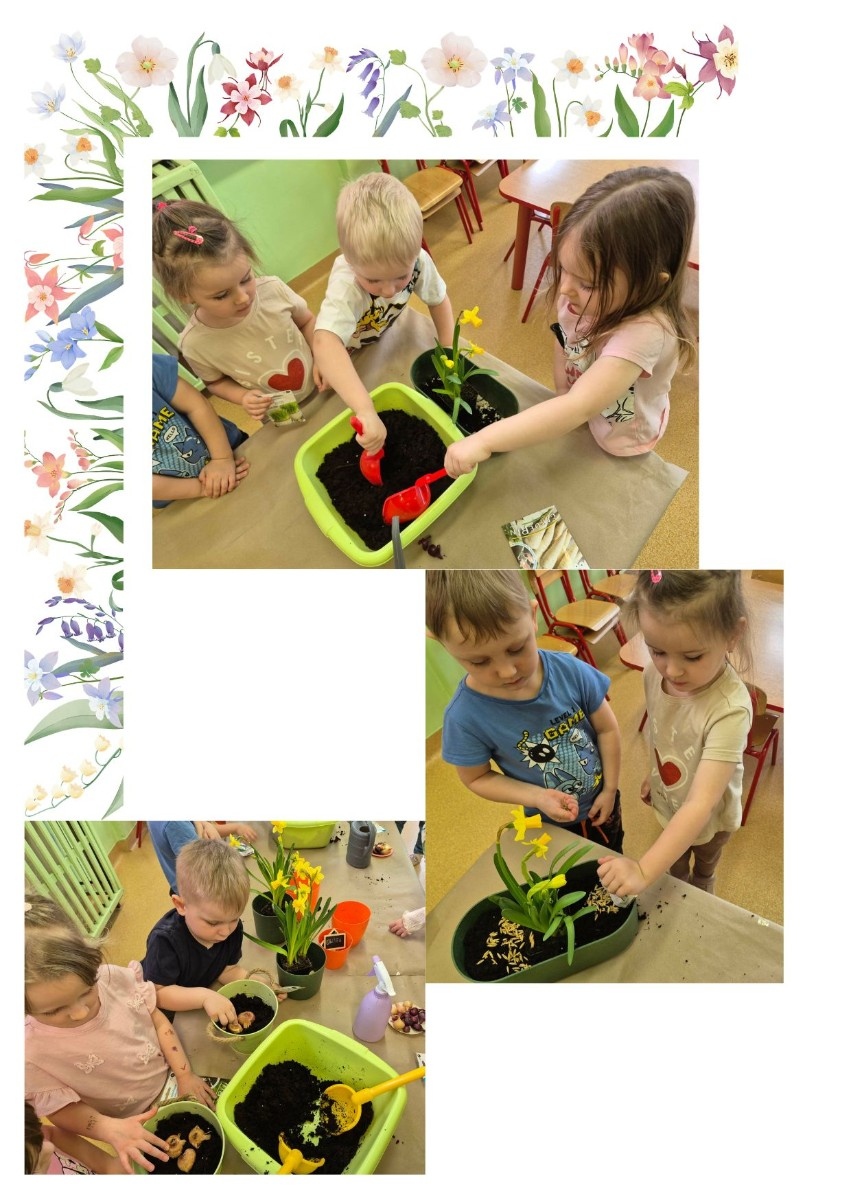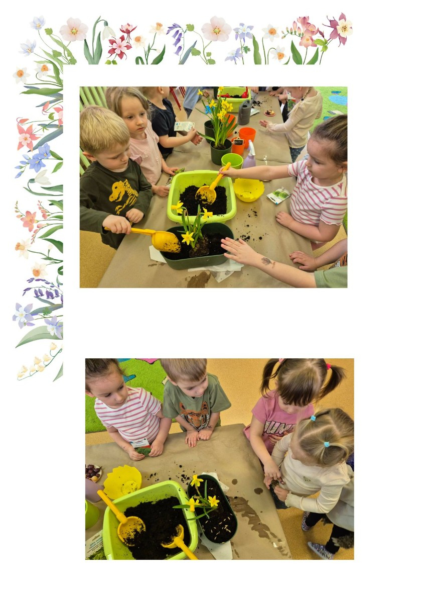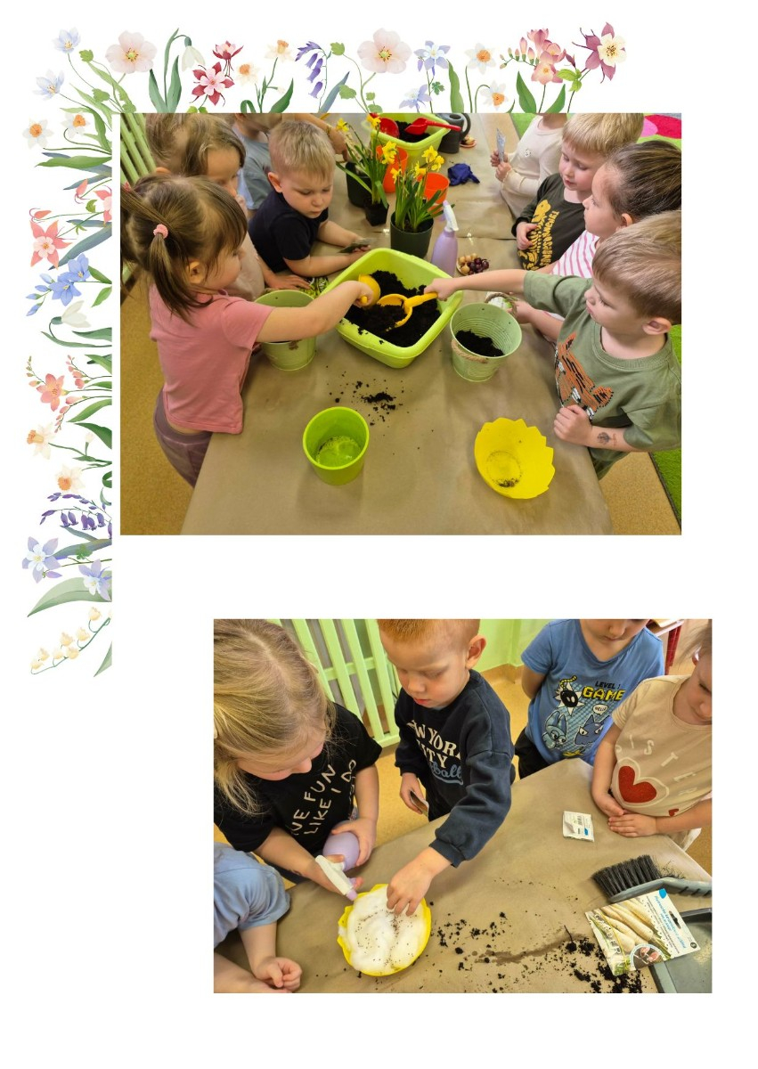Dzieci posadziły w doniczkach pietruszkę, cebulkę, sałatę, owies, żonkile i mieczyki. Wszyscy poznali etapy jakie należy wykonać. Dzięki bezpośredniej obserwacji nauczą się systematycznej pielęgnacji, a teraz czekamy na pierwsze plony.