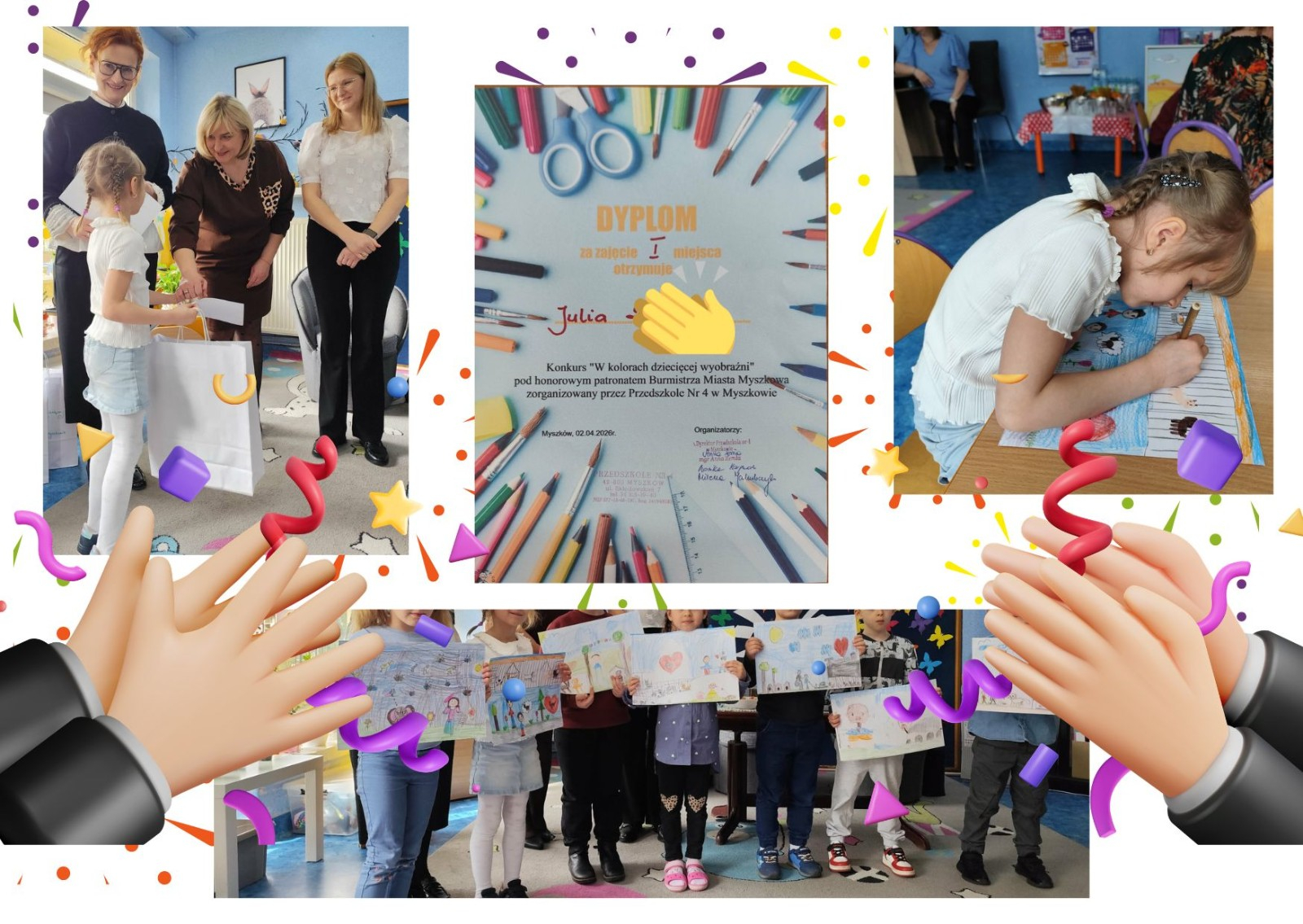 w konkursie plastycznym pt. "W kolorach dziecięcej wyobraźni" pod honorowym patronatem Burmistrza Miasta Myszkowa zorganizowany przez Przedszkole Nr 4 w Myszkowie. Serdecznie gratulujemy Julii wspaniałego osiągnięcia oraz życzymy dalszych sukcesów i rozwijania talentu artystycznego.