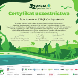 Otrzymaliśmy certyfikat za udział w 32 Akcji Sprzątania świata – Polska. Tegoroczna akcja odbywała się pod hasłem "W naturę z kulturą!" i była organizowana przez Fundację Nasza Ziemia.