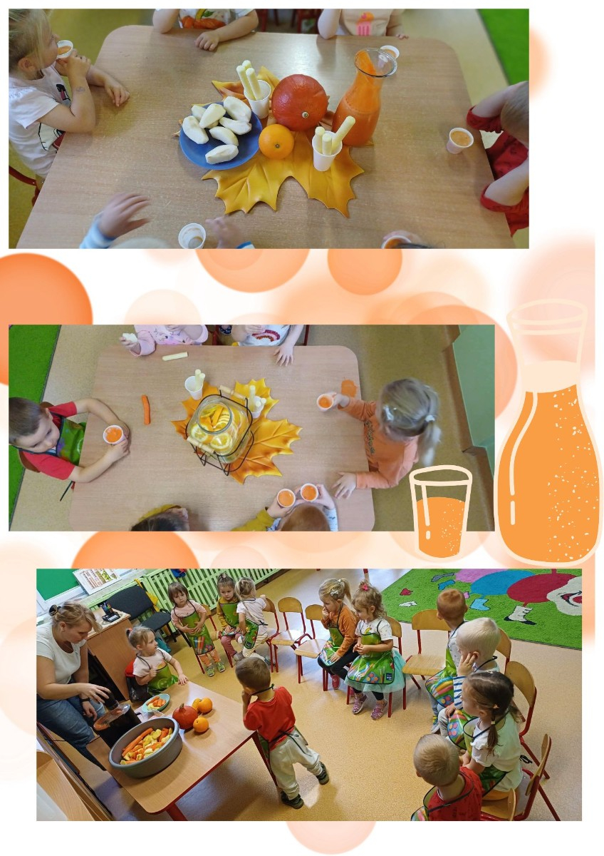 Smerfy bawiły się kolorem pomarańczowym Poznawały owoce i warzywa koloru pomarańczowego. Zrobiły sok z marchewki. Przeliczały oraz opanowały nowe słówka w języku angielskim. Dynię wykorzystywały do zabaw sensorycznych