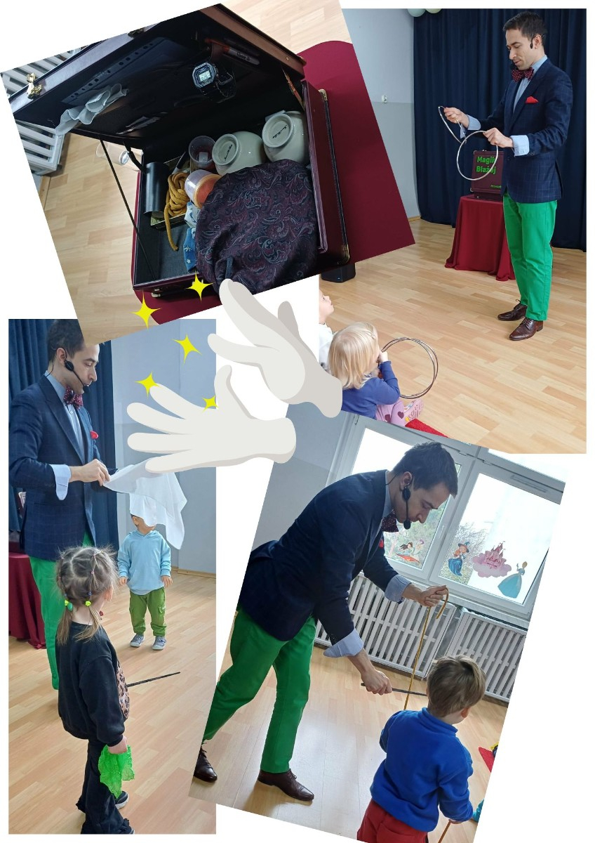 Dzisiaj nasze przedszkole odwiedził Magik Błażej, który zaprezentował dzieciom z grup Skrzaty i Smerfy pełen niespodzianek i humoru pokaz iluzji. Podczas występu przedszkolaki miały okazję zobaczyć różnorodne sztuczki, m.in. znikające chusteczki, magiczne pojawiające się przedmioty oraz proste iluzje optyczne. Przedszkolaki były bardzo zaangażowane, chętnie zgłaszały się do udziału w pokazie i z entuzjazmem reagowały na kolejne sztuczki. W trakcie występu panowała radosna atmosfera, a śmiech i okrzyki zachwytu towarzyszyły całemu wydarzeniu. Wizyta magika była dla dzieci nie tylko świetną zabawą, ale także okazją do rozwijania wyobraźni, ciekawości i spostrzegawczości. Pokaz dostarczył wielu pozytywnych emocji i na długo pozostanie w pamięci przedszkolaków.
